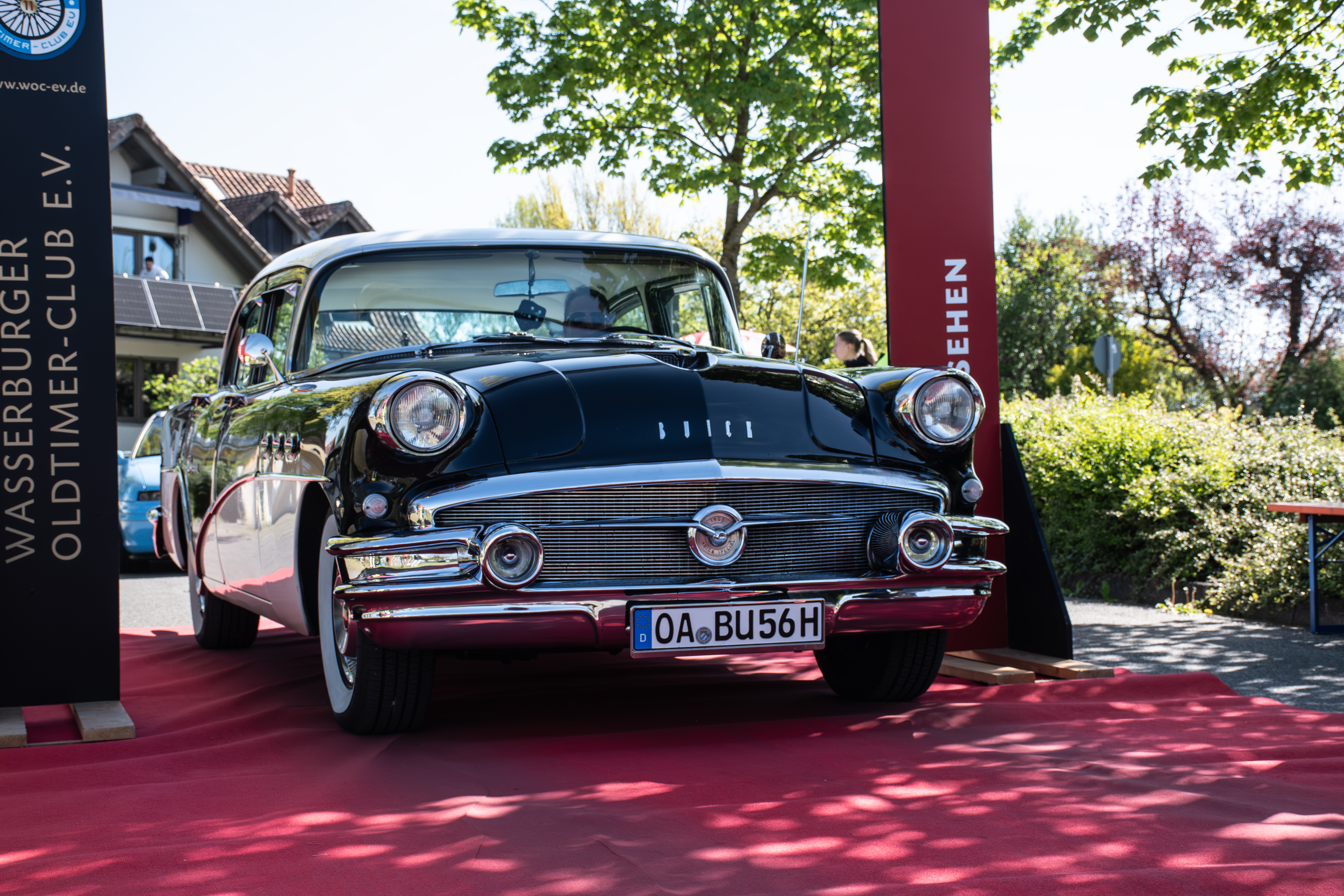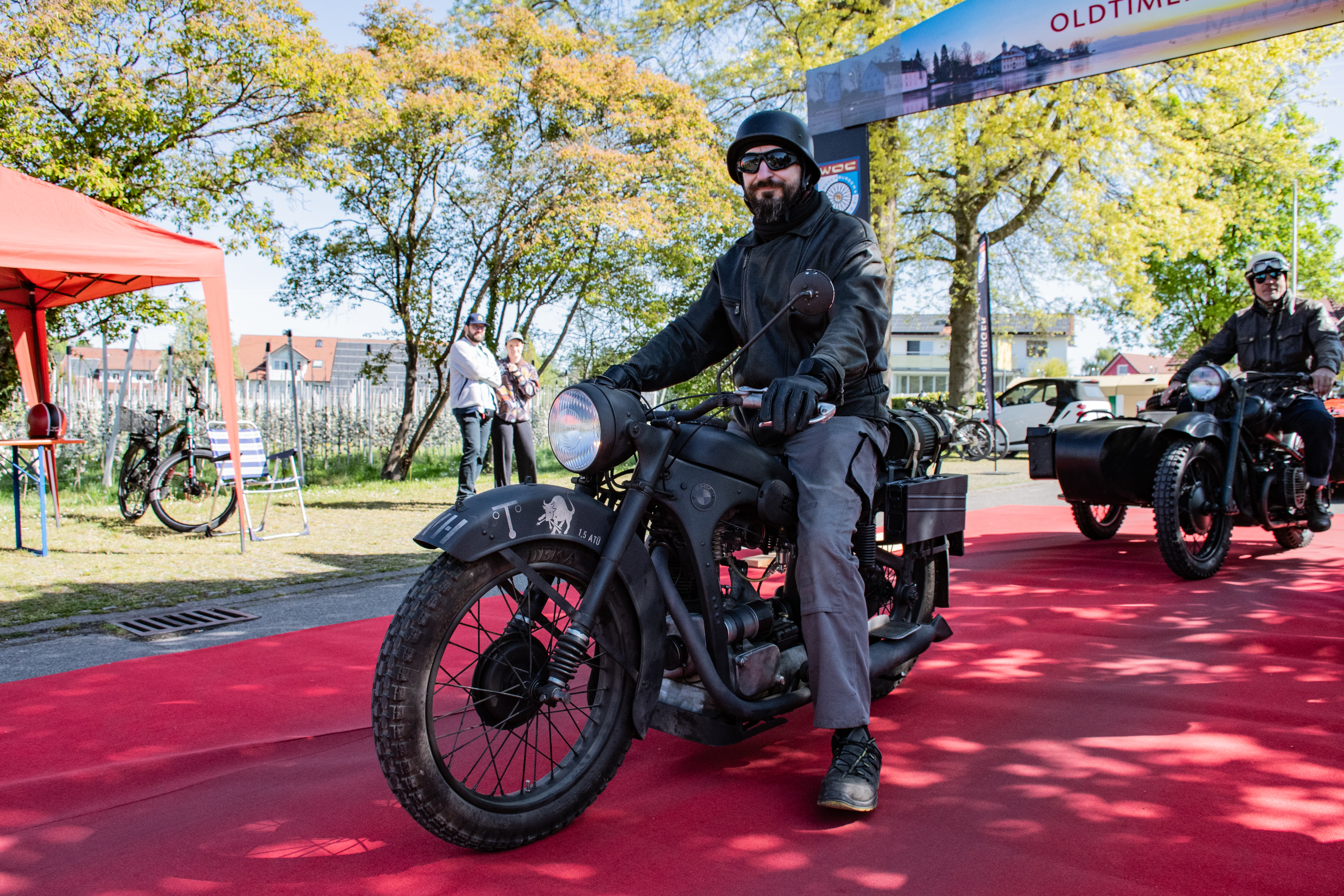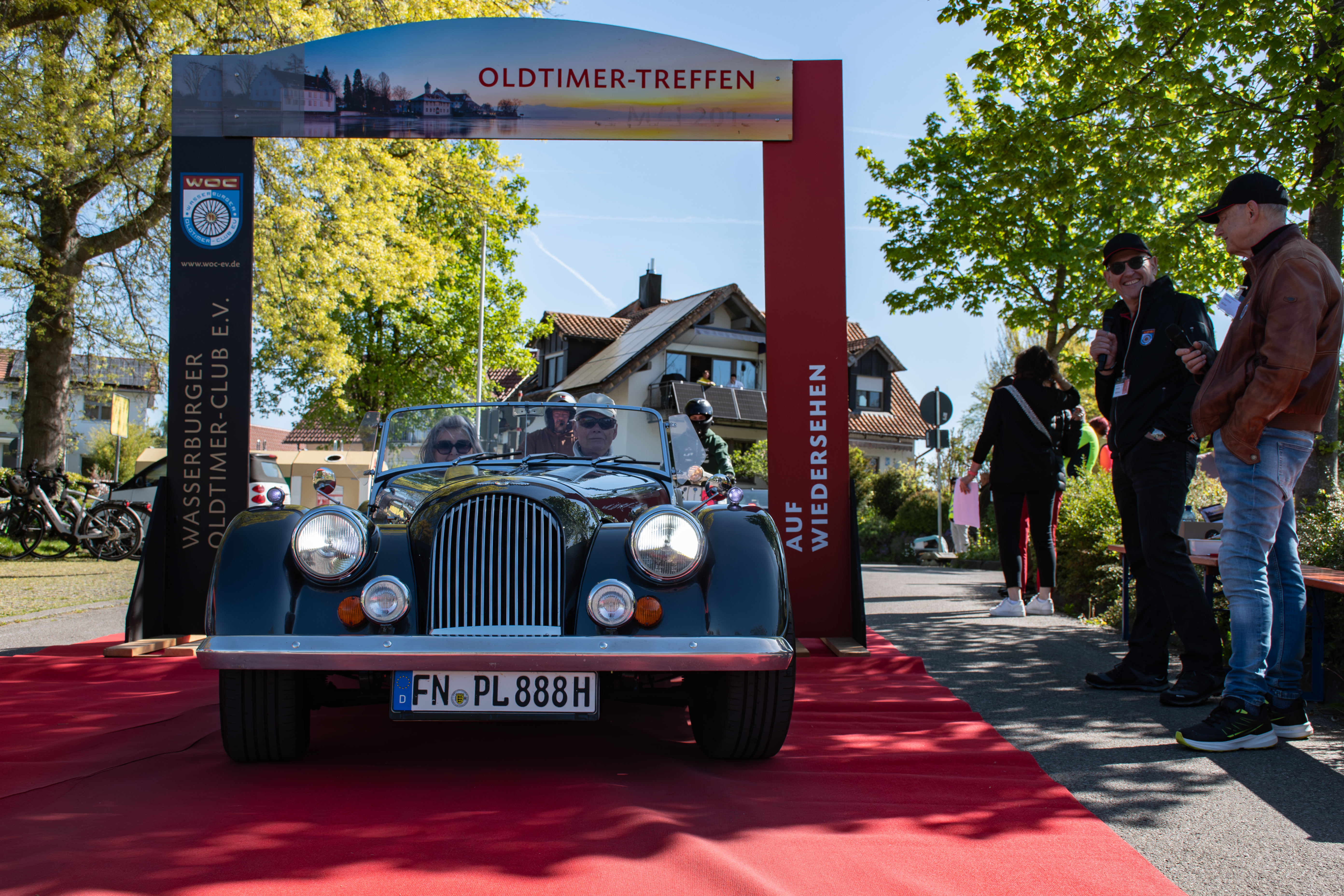 Am Zielort angekommen wurden die Oldtimerfahrer belohnt, weil wirklich sehr würdevoll empfangen: Durch einen Torbogen hindurch fahrend und über einen roten Teppich rollend wurden sie begrüßt von Manfred Müller und seinem Vereinskollegen Harald Meßmer, ihres Zeichens die Vorstände des Wasserburger Oldtimer-Clubs e.V.