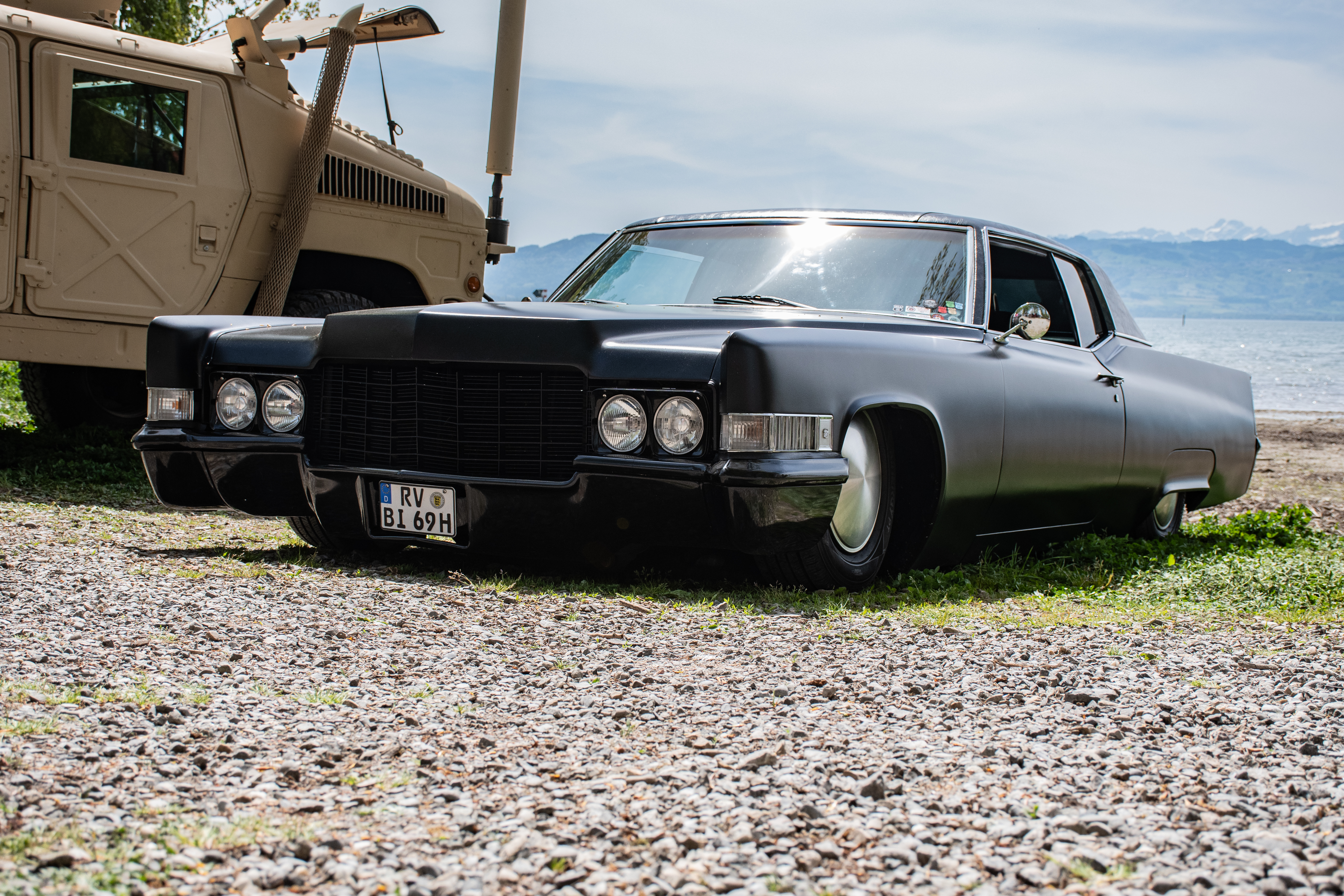 Die Polizei war zweimal da: Beim ersten Mal um nach dem rechten zu sehen, Stichwort: Naturschutzbereich. Beim zweiten Mal wegen einem Fahrzeugcrash. Aus unerfindlichen Gründen hat ein älterer Fahrzeugführer seinen wunderschönen Austin-Healey Roadster Cabrio beim Rangieren unglücklicherweise in ein anderes Fahrzeug gelenkt. Und dies nicht nur ein bisschen, sondern ungebremst das Gefälle hinab. Glück im Unglück, wenn man überhaupt davon sprechen kann war, dass das andere Fahrzeug ein Hummer bzw. Humvee war und dieser den Blech-knirschenden Aufprall – ohne Schaden – „überlebte“. Hingegen wurde bei diesem Missgeschick der Austin des älteren Herrn im Frontbereich massiv beschädigt. Personen kamen nicht zu Schaden, wenngleich einem der Austin-Besitzer sehr leid tun musste. Der ADAC kam und der rote Flitzer wurde auf die Laderampe des Abschleppwagens gezogen. Das war sicherlich ein schwarzer Tag in seinem Klassiker-Leben.