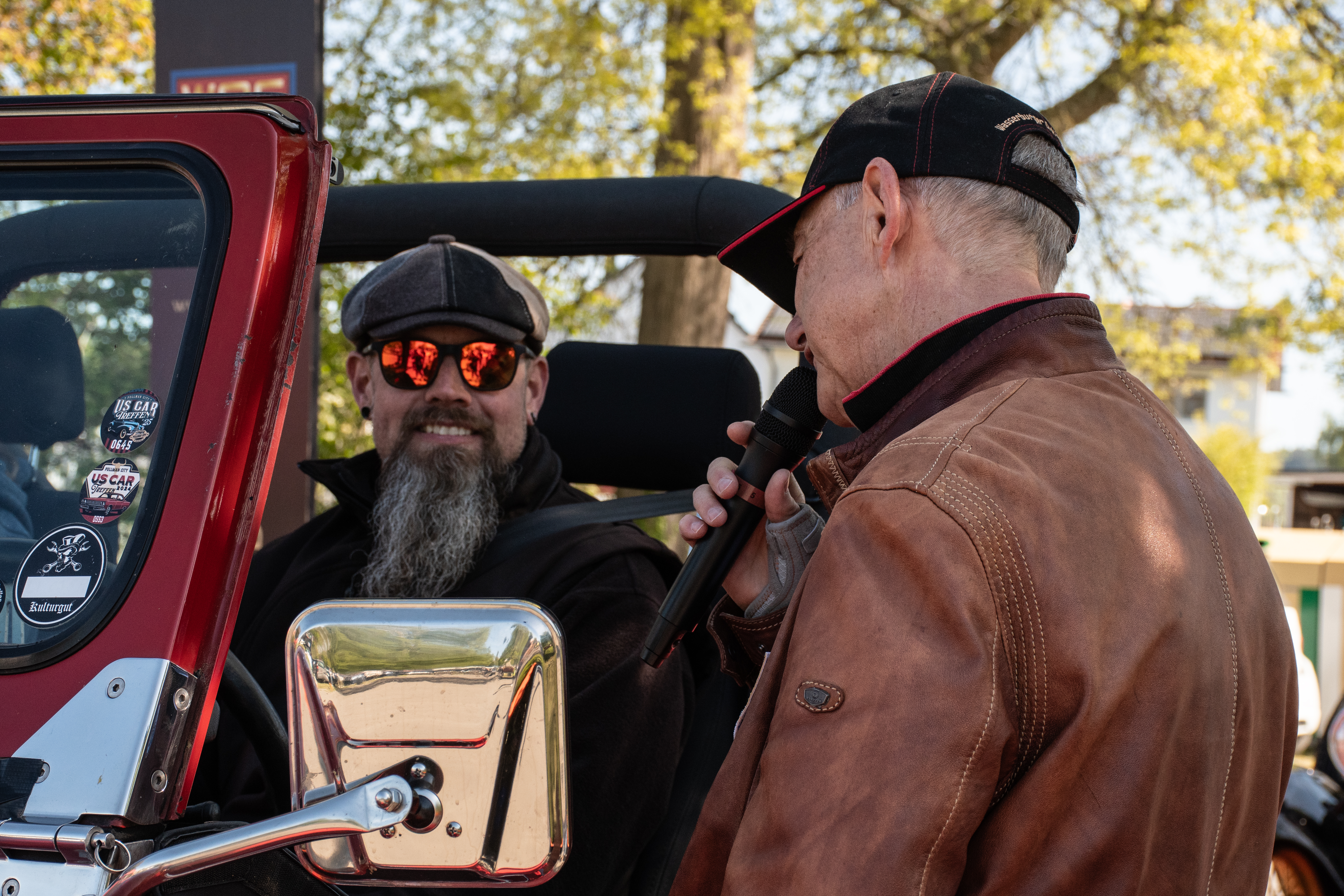 So erweisen sich die beiden Vereinshäuptlinge wahrlich als wandelnde Lexika der Automobilgeschichte. Sie erzählten den am Einfahrtsspektakel befindlichen Zuschauern einige Eckdaten zu den jeweils ankommenden Automobilen. Mit Mikrofonen ausgestattet interviewten sie einige ankommende Fahrer zu ihrem Automobil. Es war sehr interessant von dem ein oder anderen Klassik-Enthusiasten mehr über die Geschichte zu erfahren; wann, wie und wo er/sie zu seinem bzw. ihrem Blechschatz gekommen war.